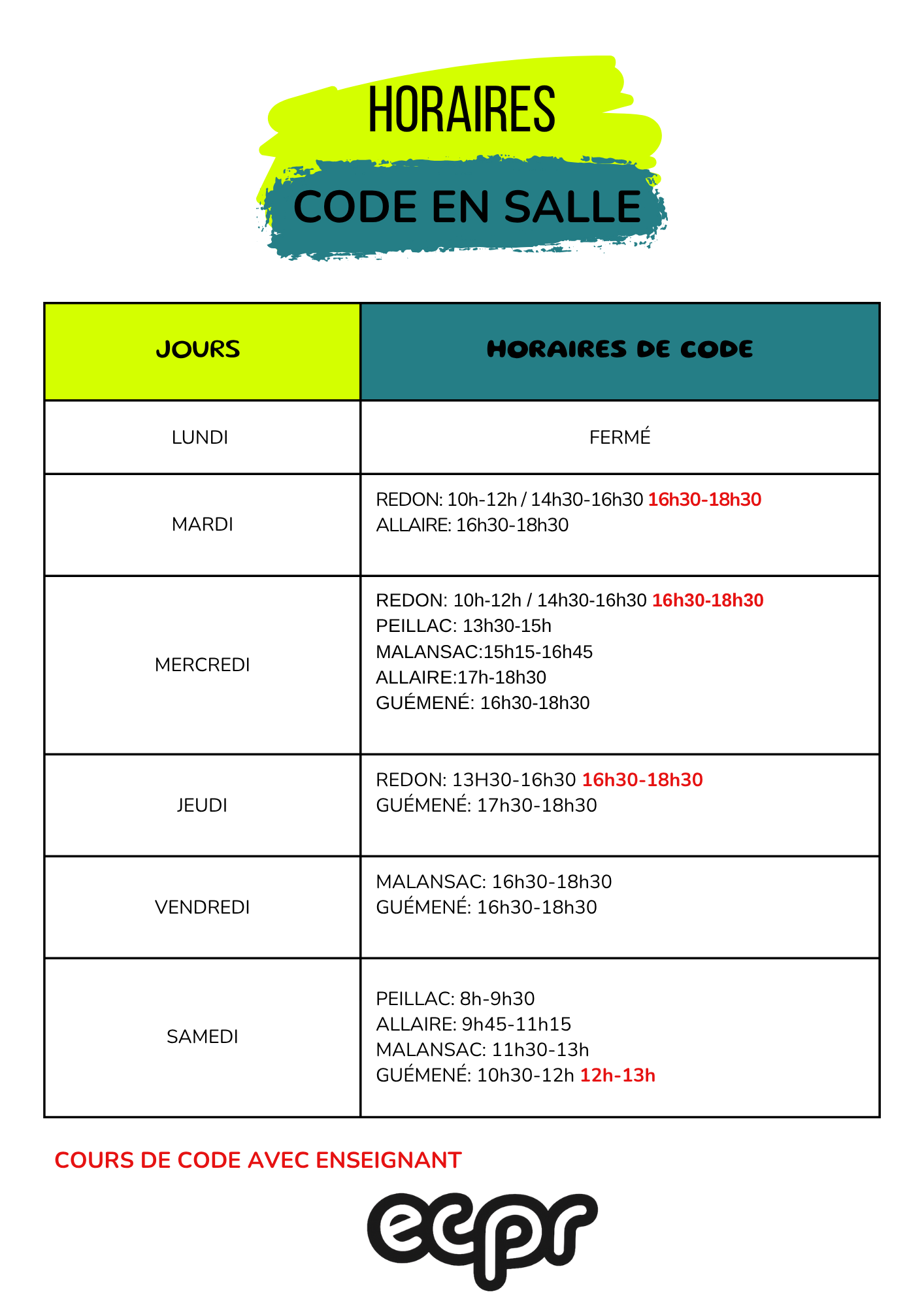HORAIRES DE CODE